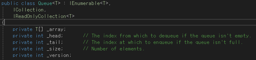 실제로 정의를 타고 들어가보면 Queue클래스에 head, tail, size가 존재하는 것을 알 수 있다. 순환 큐는 배열로 구현되는데 tail(후단)이 배열이 빈칸이 있을 때 다시 Head로 가서 Enqueue가 가능하게 계속해서 순환하는 구조를 가지는 것이다.